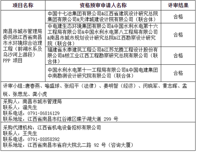 2021年11月19日,江西省機(jī)電設(shè)備招標(biāo)有限公司關(guān)于江西省南昌市水環(huán)境綜合治理工程(前湖水系及烏沙河上游段)PPP 項(xiàng)目(招標(biāo)編號(hào):JXTC2021020278)資格預(yù)審結(jié)果公示 江西省機(jī)電設(shè)備招標(biāo)有限公司受南昌市城市管理局委托就江西省南昌市水環(huán)境綜合治理工程(前湖水系及烏沙河上游段)PPP 項(xiàng)目...