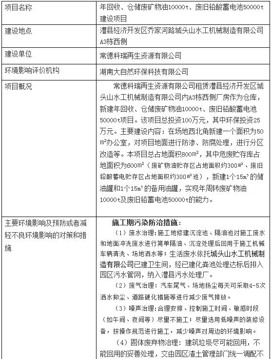 日前,湖南澧縣對年回收、倉儲(chǔ)廢礦物油10000t、廢舊鉛酸蓄電池50000t建設(shè)項(xiàng)目環(huán)境影響報(bào)告表進(jìn)行擬審批公示,詳情如下:年回收、倉儲(chǔ)廢礦物油10000t、廢舊鉛酸蓄電池50000t建設(shè)項(xiàng)目環(huán)境影響報(bào)告表擬審批公示經(jīng)審議,我局?jǐn)M于近日內(nèi)批準(zhǔn)《年回收、倉儲(chǔ)廢礦物油10000t、廢舊鉛酸蓄電池5000...