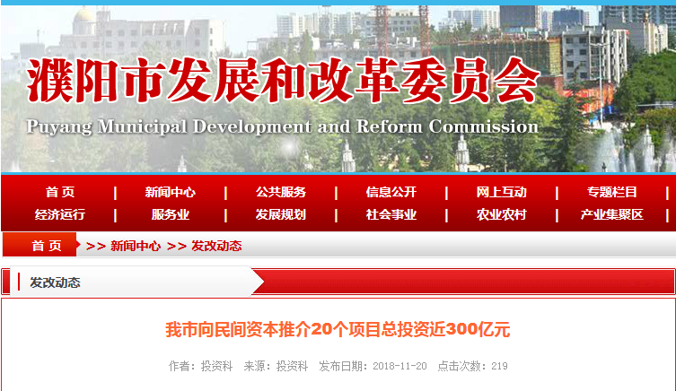 11月16日,河南省召開2018年向民間資本推介項(xiàng)目會(huì)議。會(huì)上,我市向民間資本推介了重點(diǎn)領(lǐng)域20個(gè)項(xiàng)目,總投資299.04億元,分別占全省的9.17%、11.4%。從項(xiàng)目具體情況看,這批推介項(xiàng)目涵蓋了交通、水利、城市建設(shè)、生態(tài)環(huán)保、社會(huì)民生等五個(gè)方面。關(guān)交通領(lǐng)域項(xiàng)目1個(gè),總投資43160萬元,主要建...