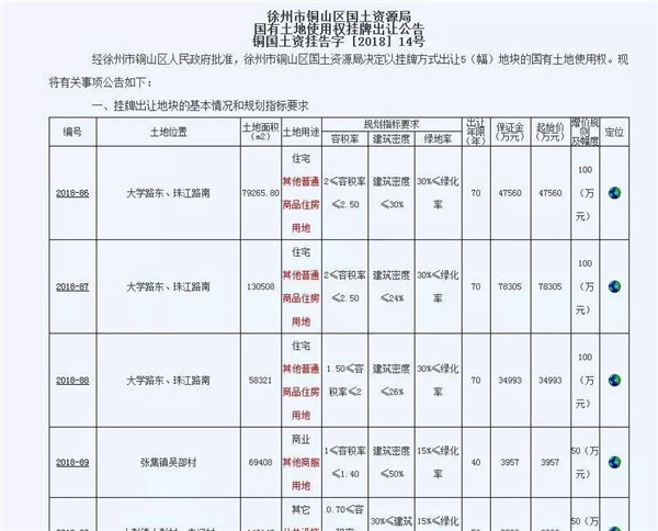 2018年11月15日,徐州市銅山區(qū)國(guó)土資源局發(fā)布國(guó)有土地使用權(quán)掛牌出讓公告銅國(guó)土資掛告字[2018]14號(hào),掛牌出售5塊地塊。其中包括2018-90號(hào)地塊。巧合的是,該幅地塊同徐州市銅山區(qū)國(guó)土資源局于10月18日發(fā)布的國(guó)有土地使用權(quán)掛牌出讓公告銅國(guó)土資掛告字[2018]12號(hào)中的2018-77地塊...