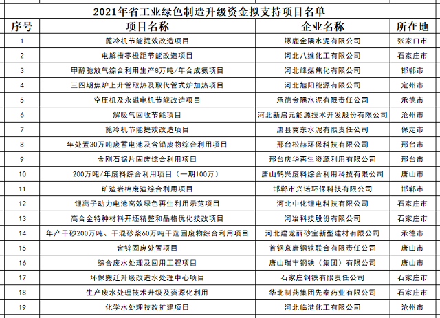 關(guān)于2021年省工業(yè)綠色制造升級(jí)資金擬支持項(xiàng)目的公示 按照《2021年河北省工業(yè)綠色制造升級(jí)資金申報(bào)指南》要求,通過各市(含定州、辛集)工業(yè)和信息化局篩選上報(bào)、專家評(píng)審、現(xiàn)場(chǎng)審查和集中研究等程序后,我廳擬對(duì)19個(gè)項(xiàng)目給予支持(名單詳見附件)?,F(xiàn)將項(xiàng)目予以公示,請(qǐng)社會(huì)各界對(duì)項(xiàng)目及承擔(dān)單位相關(guān)情況進(jìn)行監(jiān)...