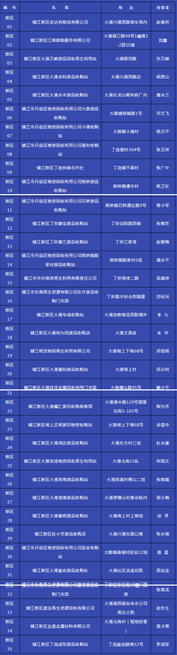 根據(jù)《江蘇省特種行業(yè)治安管理條例》規(guī)定,對生產(chǎn)性收購業(yè)實行名錄管理制度。符合條件的,由所在地市、縣人民政府公安機關(guān)列入名錄,并向社會公布。現(xiàn)將己列入名錄的35家生產(chǎn)性業(yè)公布如下:期間,上述生產(chǎn)性廢舊金屬收購業(yè)的經(jīng)營名稱、地址、經(jīng)營者等發(fā)生變更的,應及時到公安機關(guān)進行報備。市公安局新區(qū)分局二O一八年十...