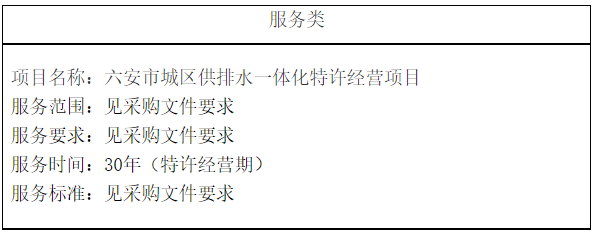 六安市城區(qū)供排水一體化特許經(jīng)營項目成交結(jié)果公告 一、項目編號:20210285 二、項目名稱:六安市城區(qū)供排水一體化特許經(jīng)營項目 三、成交信息: 1、成交金額:政府付費凈現(xiàn)值278122.09萬元。 2、成交單位信息: 聯(lián)合體牽頭單位 供應(yīng)商名稱:長江生態(tài)環(huán)保集團有限公司 供應(yīng)商地址:武漢市江岸區(qū)六...