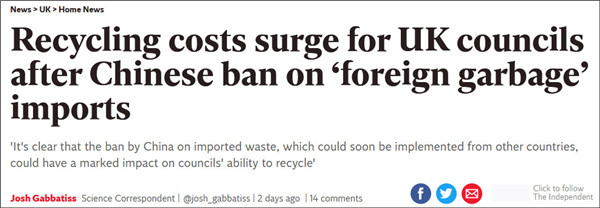 中國(guó)自今年1月起為配合新推出的環(huán)境政策,拒收大部分的外國(guó)紙類和,英國(guó)地方政府對(duì)此叫苦連天。根據(jù)調(diào)查發(fā)現(xiàn),因中國(guó)等國(guó)家決定不再回收來(lái)自外國(guó)的垃圾,造成2成英國(guó)地方政府只能自行救濟(jì)處理垃圾而造成預(yù)算吃緊。當(dāng)?shù)卣粲鯓I(yè)者,應(yīng)共同負(fù)擔(dān)激增的回收成本,并減少使用不易回收的包裝材料。據(jù)《英國(guó)獨(dú)立報(bào)》10月20...