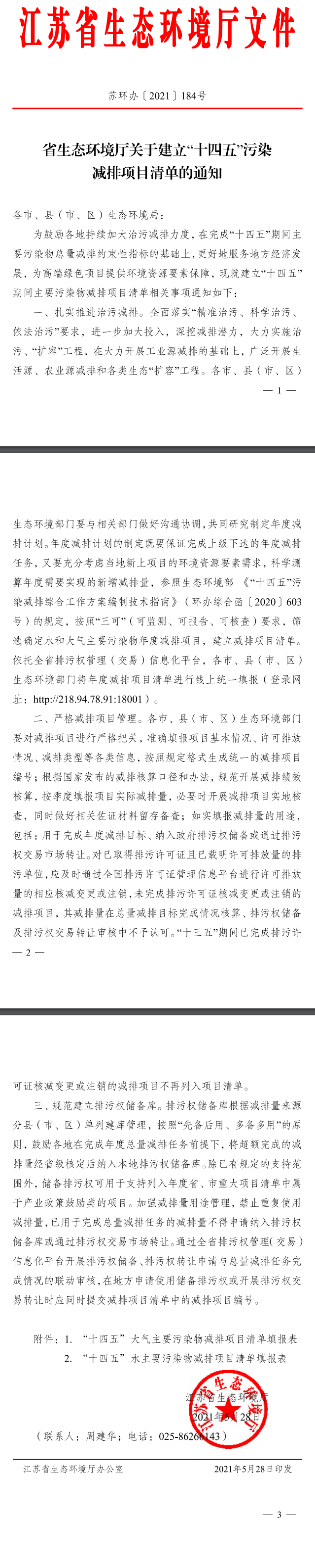 省生態(tài)環(huán)境廳關(guān)于建立“十四五”污染減排項(xiàng)目清單的通知各市、縣(市、區(qū))生態(tài)環(huán)境局: 為鼓勵(lì)各地持續(xù)加大治污減排力度,在完成“十四五”期間主要污染物總量減排約束性指標(biāo)的基礎(chǔ)上,更好地服務(wù)地方經(jīng)濟(jì)發(fā)展,為高端綠色項(xiàng)目提供環(huán)境資源要素保障,現(xiàn)就建立&ldqu...