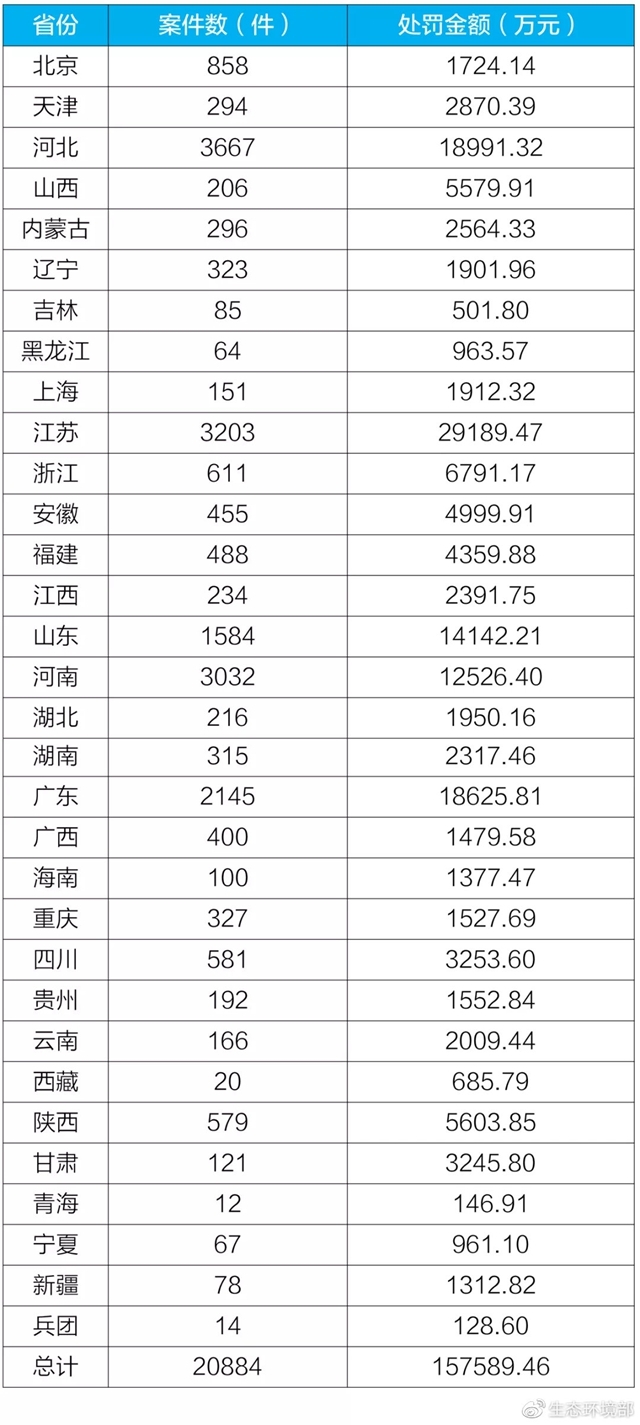 近日,生態(tài)環(huán)境部向媒體通報(bào)各地2021年1-3月環(huán)境行政處罰案件與《環(huán)境保護(hù)法》配套辦法的執(zhí)行情況。 一、環(huán)境行政處罰案件辦理情況 2021年1-3月,全國共下達(dá)環(huán)境行政處罰決定書2.09萬份,罰沒款數(shù)額總計(jì)15.76億元,案件平均罰款金額7.55萬元。 2021年1-3月,行政處罰案件數(shù)量排名前五...