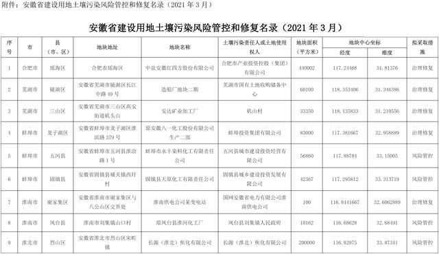 依據(jù)《中華人民共和國土壤污染防治法》和《污染地塊土壤環(huán)境管理辦法(試行)》,結(jié)合近期建設(shè)用地土壤污染狀況調(diào)查評估、風(fēng)險管控和治理修復(fù)等情況,省生態(tài)環(huán)境廳會同自然資源廳對《安徽省建設(shè)用地土壤污染風(fēng)險管控和修復(fù)名錄(2021年2月)》進行了動態(tài)更新,形成《安徽省建設(shè)用地土壤污染風(fēng)險管控和修復(fù)名錄(202...