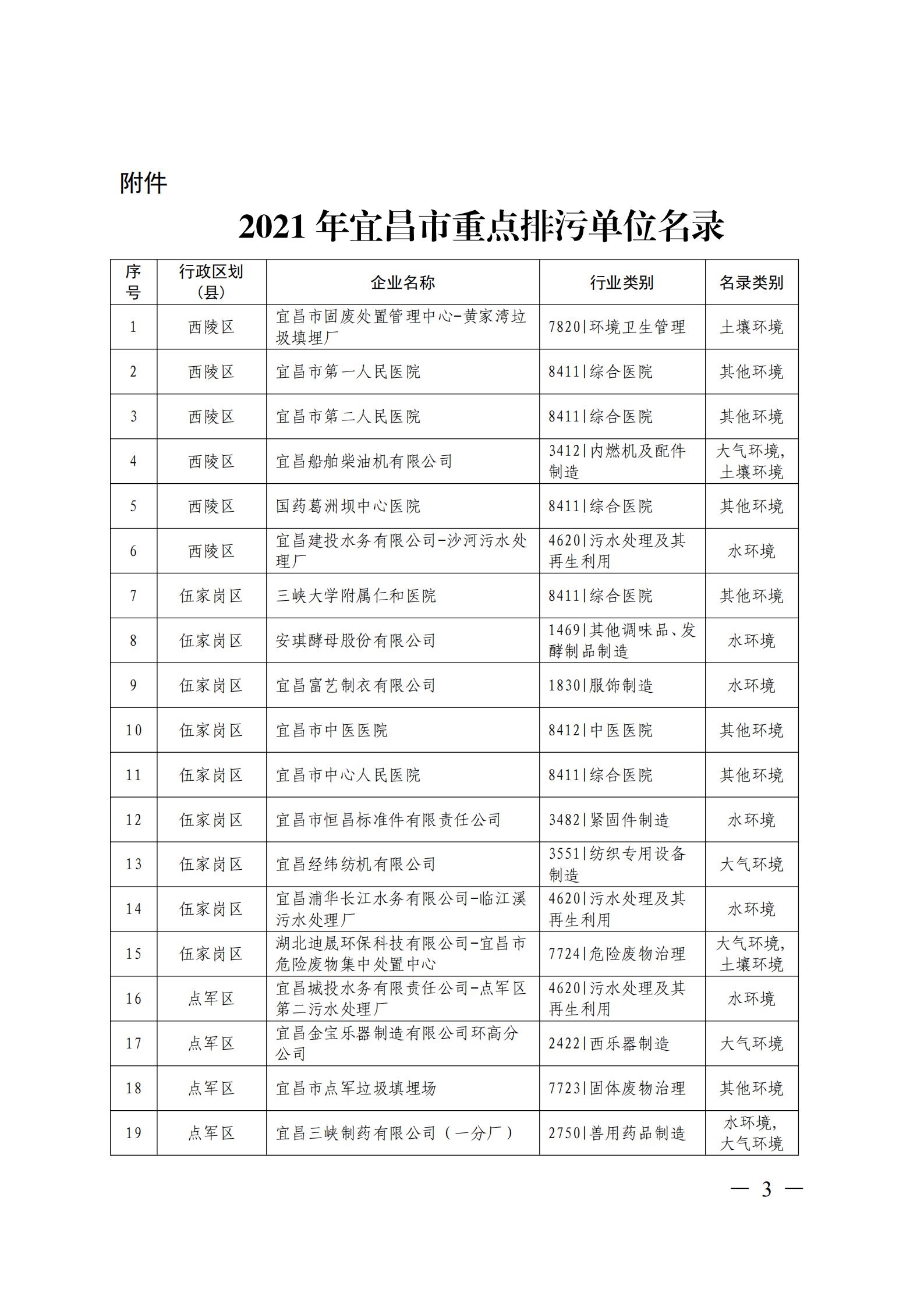 關(guān)于印發(fā)《2021年宜昌市重點(diǎn)排污單位名錄》的通知宜市環(huán)發(fā)[2021]1號(hào) 各縣市區(qū)分局,局機(jī)關(guān)各科室、局屬各單位: 為進(jìn)一步加強(qiáng)重點(diǎn)污染源的監(jiān)督管理,有效控制和減少污染物排放,促進(jìn)環(huán)境質(zhì)量改善,根據(jù)《重點(diǎn)排污單位名錄管理規(guī)定(試行)》(環(huán)辦監(jiān)測(cè)〔2017〕86號(hào))、生態(tài)環(huán)境部《關(guān)于更新2021年重...