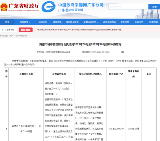 圖片來(lái)源:廣東省政府采購(gòu)廣東省政府采購(gòu)網(wǎng)消息,近日,英德市城市管理和綜合執(zhí)法局發(fā)布2022年08月至2022年10月政府采購(gòu)意向,英德市“互聯(lián)網(wǎng)+城鄉(xiāng)環(huán)衛(wèi)一體化”P(pán)PP項(xiàng)目計(jì)劃于2022年10月份開(kāi)展政府采購(gòu)。采購(gòu)需求概況:1.環(huán)衛(wèi)作業(yè)設(shè)備周期更新,按服務(wù)范圍增加投入專業(yè)環(huán)衛(wèi)設(shè)備(包括但不限于高壓清...