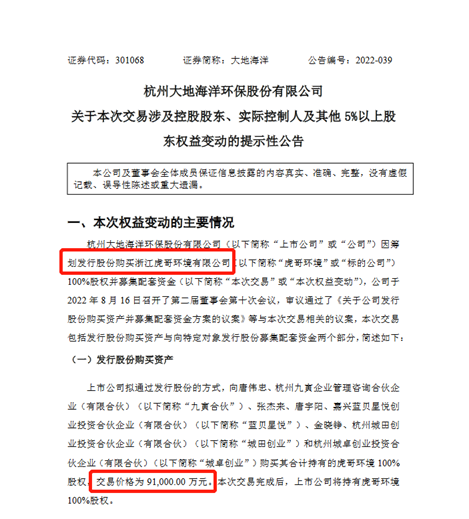 生活垃圾分類(lèi)回收“藍(lán)?!闭絹?lái)越多有實(shí)力的公司競(jìng)逐。8月17日,大地海洋(301068.SZ)披露重大資產(chǎn)重組草案,公司擬通過(guò)發(fā)行股份的方式,向唐偉忠、九寅合伙、張杰來(lái)、唐宇陽(yáng)、藍(lán)貝星悅、金曉錚、城田創(chuàng)業(yè)和城卓創(chuàng)業(yè)購(gòu)買(mǎi)其合計(jì)持有的虎哥環(huán)境100%股權(quán),交易價(jià)格為9.1億元;同時(shí)擬向合計(jì)不超過(guò)35...