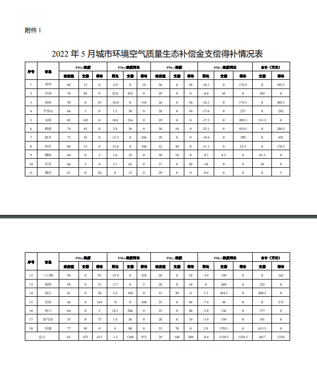 根據(jù)《河南省污染防治攻堅(jiān)戰(zhàn)領(lǐng)導(dǎo)小組辦公室關(guān)于印發(fā)河南省城市環(huán)境空氣質(zhì)量生態(tài)補(bǔ)償辦法(試行)等辦法的通知》(豫環(huán)攻堅(jiān)辦〔2020〕15號(hào))要求,河南省生態(tài)環(huán)境廳廳對(duì)各省轄市的城市環(huán)境空氣質(zhì)量生態(tài)補(bǔ)償金的支償、得補(bǔ)情況進(jìn)行了計(jì)算。截止2022年5月,各省轄市共支償城市環(huán)境空氣質(zhì)量生態(tài)補(bǔ)償金2617萬(wàn)元,...