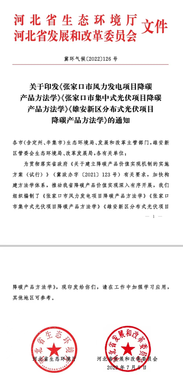由張家口市生態(tài)環(huán)境局組織編制!全國(guó)首個(gè)市級(jí)“綠電”降碳產(chǎn)品方法學(xué)獲批發(fā)布實(shí)施?!