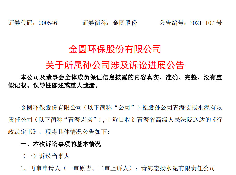 因?yàn)?萬(wàn)元的環(huán)保處罰,導(dǎo)致3655萬(wàn)元稅收優(yōu)惠沒(méi)有了,是不是有點(diǎn)因小失大?2021年12月29日,金圓環(huán)保股份有限公司(下稱(chēng)“金圓股份”)發(fā)布公告,宣布了一起所屬孫公司青海宏揚(yáng)水泥有限責(zé)任公司(下稱(chēng)“青海宏揚(yáng)”)涉及訴訟的進(jìn)展,青海宏揚(yáng)要求確認(rèn)環(huán)保處罰無(wú)效的再審申請(qǐng)被法院駁回。這意味著,經(jīng)歷了一審、...
