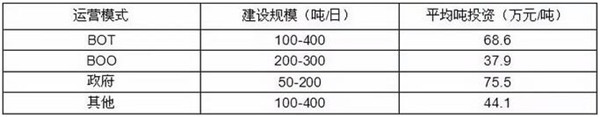 從不同運營模式來看,相對政府投資而言,BOT、BOO模式建設(shè)成本明顯更低,且由于很多小規(guī)模的處理設(shè)施采用政府投資或BOT模式建設(shè),導(dǎo)致這兩種模式的平均噸投資大幅高于BOO模式。