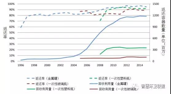芬蘭的押金體系實(shí)現(xiàn)了極高的回收率。在PALPA體系剛剛成立的1996年,一次性金屬罐的回收率就已經(jīng)達(dá)到了59%,并馬上于第二年上升到了79%。到了2009年,金屬罐的回收率已經(jīng)超過90%。同樣地,PET瓶的押金體系在2008年開始實(shí)施時(shí),返還率就已經(jīng)達(dá)到了71%,之后在兩年內(nèi)便上升到了90%以上。玻璃瓶在芬蘭擁有很長的押金制度實(shí)施積累,因此在PALPA在建立針對(duì)玻璃瓶的回收體系后,回收率就一直高于80%。從圖11還可以看出,一次性鐵罐的回收量自2004年起至2012年,一直都在迅速上升,并且保持穩(wěn)定的高回收率,反映出芬蘭飲料產(chǎn)業(yè)使用一次性金屬罐替代可重復(fù)使用玻璃瓶的趨勢??芍貜?fù)使用玻璃瓶的回收率則更高,在2014年時(shí)為97%、2015年時(shí)為98%。