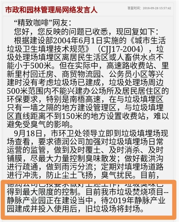 針對(duì)相關(guān)問題,市市政和園林管理局網(wǎng)絡(luò)發(fā)言人作出了回應(yīng),表示會(huì)進(jìn)一步督促垃圾填埋場(chǎng)的管理方加強(qiáng)對(duì)日常運(yùn)營(yíng)的監(jiān)管工作。回復(fù)中還提及重要一點(diǎn)——