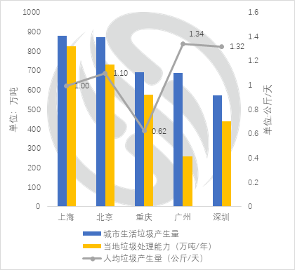 根據(jù)《2017年全國大、中城市固體廢物污染環(huán)境防治年報》,2016年我國城市生活垃圾產(chǎn)生量上海居首,北京次之??紤]到常住人口,人均生活垃圾產(chǎn)生量最大的城市為廣州,深圳次之??梢钥闯瞿戏匠鞘猩罾娜司a(chǎn)量相對較高,E20研究院認(rèn)為這可能與不同地域人口飲食習(xí)慣不同存在關(guān)系。結(jié)合當(dāng)年各城市實際處理能力來看,廣州缺口明顯,且人均垃圾產(chǎn)生量大,垃圾圍城形勢最為嚴(yán)峻。本文僅選取人均日均生活垃圾產(chǎn)生量在1公斤左右的四座一線城市:廣州、深圳、北京、上海進行分析。