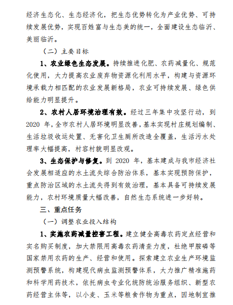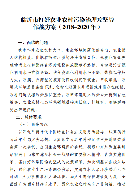 近日,臨沂市人民政府發(fā)布關(guān)于印發(fā)臨沂市打好農(nóng)業(yè)農(nóng)村污染治理攻堅(jiān)戰(zhàn)作戰(zhàn)方案(2018-2020年)的通知,方案要求,到2020年,全市農(nóng)村人居環(huán)境明顯改善,基本實(shí)現(xiàn)村莊規(guī)劃編制、生活垃圾收運(yùn)處置、無(wú)害化衛(wèi)生廁所改造全覆蓋,生活污水處理率大幅提高,村容村貌明顯改觀。詳情如下: