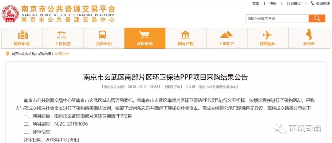 南京市玄武區(qū)南部片區(qū)環(huán)衛(wèi)保潔PPP項目中標結(jié)果