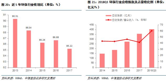 去杠桿條件下提升投資效率,維持二者緊平衡。對于融資環(huán)境帶來的壓力,企業(yè)在對于投資以及項目招標上既需要清楚認識投資目的,也需要盡可能提高資金運用效率,努力做到有限資金利用價值的最大化。近五年來環(huán)保行業(yè)的收入現(xiàn)金比不斷下降,由2013年的90.31%下降到2017年85.22%,但行業(yè)的應收賬款占營收比例卻不斷增長,由去年的41.52%上漲到60.27%。因此,強化風險意識、加強經營管理、提升回款速度成為公司發(fā)展重中之重,怎樣實現(xiàn)有效融資以及改善現(xiàn)金流迫在眉睫。