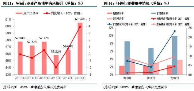 融資遇困,資產負債率高,行業(yè)債務壓力大。對于環(huán)保行業(yè)來說,由于其行業(yè)性質和商業(yè)模式,前期往往需要較大比例的資金投入,墊資較多,所以融資形勢對于推動項目進行起到了至關重要的作用。通過對我們選取的115個環(huán)保行業(yè)股票進行跟蹤,發(fā)現(xiàn)2018上半年融資環(huán)境持續(xù)緊縮、環(huán)保公司資產負債率進一步提升。前三季度整體資產負債率60.54%,同比增長3.94PCT,其中有69家企業(yè)的資產負債率較去年同期有不同程度的增長,并且有32家企業(yè)的資產負債率已經超過60%。前三季度環(huán)保公司期間費用率為14.28%,同比增加2.16PCT,繼續(xù)呈上升趨勢,其中管理費用率8.41%,同比上升1.15個PCT;財務費用率3.54%,同比上升0.79PCT;銷售費用率2.33%,同比上升0.23PCT。我們對行業(yè)21家核心龍頭公司近三年的融資情況進行了分析,以啟迪桑德為例,2016年發(fā)行債券總額為70億元,利率水平在2.75%~4.05%之間,2017年發(fā)行債券總額為65億元,利率水平為4.5%~6.7%,2018年發(fā)行債券總額為35億元,利率水平則為5%~6.3%,發(fā)債規(guī)模逐年遞減,債券利率卻逐年增加;股權融資方面,只有五家企業(yè)成功實現(xiàn)股權融資,分別為博世科、中國光大國際、金圓股份、啟迪桑德以及盈峰環(huán)境,企業(yè)在資金融通環(huán)節(jié)仍舊面臨較大壓力。