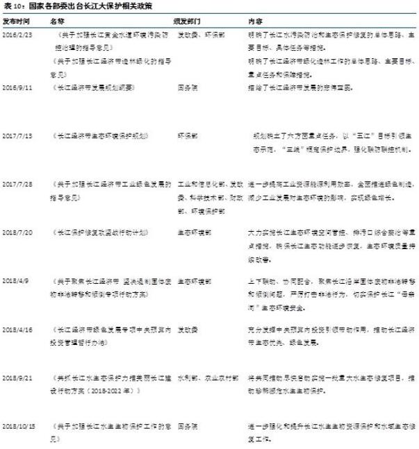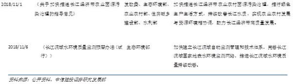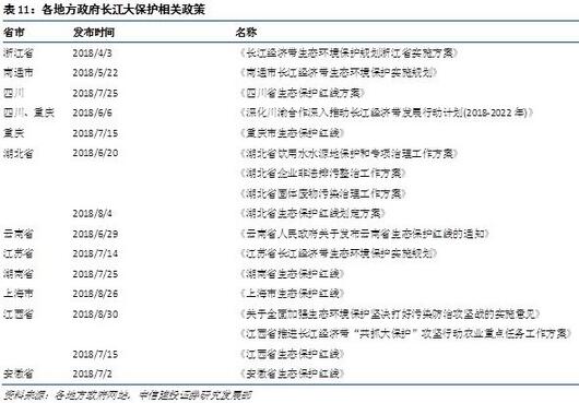 截至2018年11月,國家各部委已發(fā)布12臺關于長江經濟帶保護和發(fā)展的政策,分別從長江經濟帶的發(fā)展規(guī)劃、污染治理指標、資金保障、監(jiān)測機制等方面對長江大保護行動提供指導和支持。其中《長江經濟帶生態(tài)環(huán)境保護規(guī)劃》明確了長江經濟帶在2020年的環(huán)境指標。地方層面上,各地方政府均制定了地方《生態(tài)保護紅線》,確定了生態(tài)保護的保護區(qū)域,并依據(jù)地方各省市自身環(huán)境情況制定環(huán)境保護行動方案。