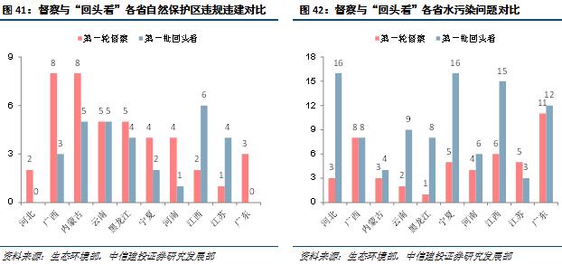 第一輪環(huán)保督察與“回頭看”緊密聯(lián)系、各有側重。各地黨委政府部門為重要責任主體,環(huán)保督察督企亦督政,督察對象均包括了省級、市級黨委、政府及有關部門和地方企業(yè),實現(xiàn)了對“黨政企”的全覆蓋;兩次行動的力度不斷加強;環(huán)保督察堅持問題導向,“回頭看”中央批準的督察報告及整改方案的落實情況;督察和“回頭看”的同省份責令整改數(shù)大不同。