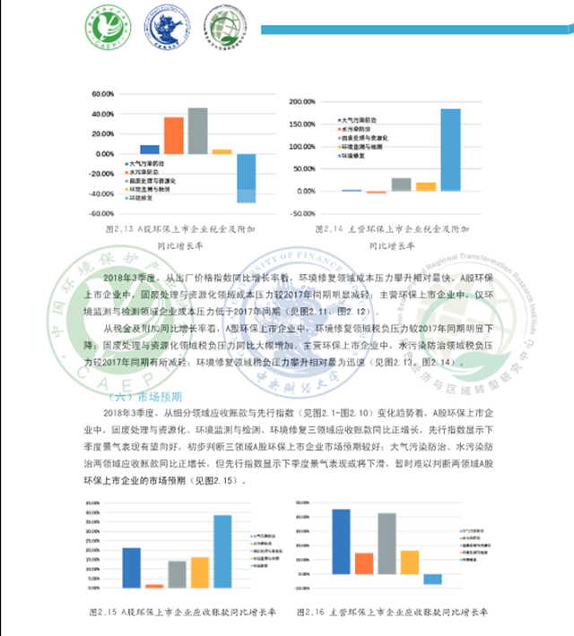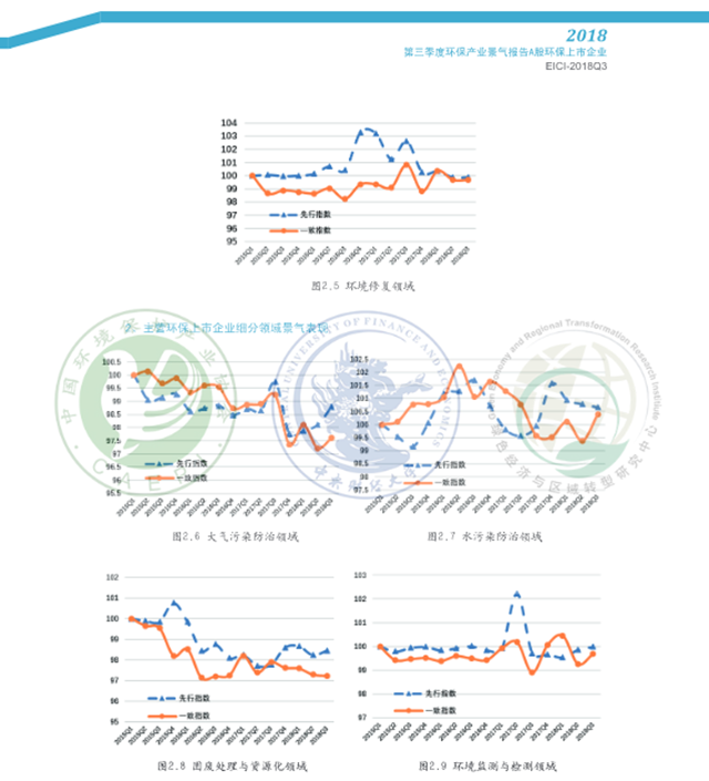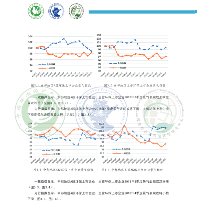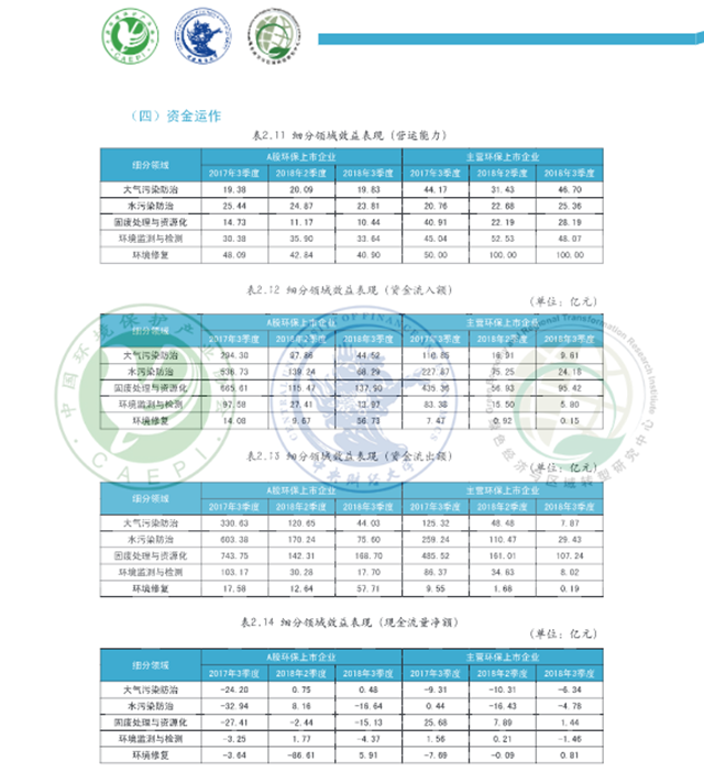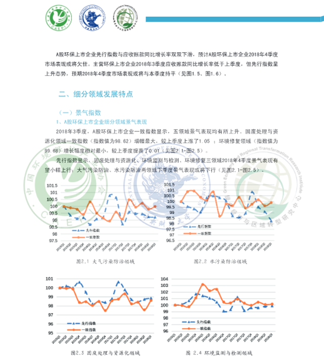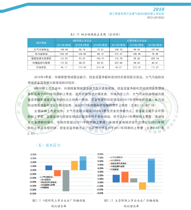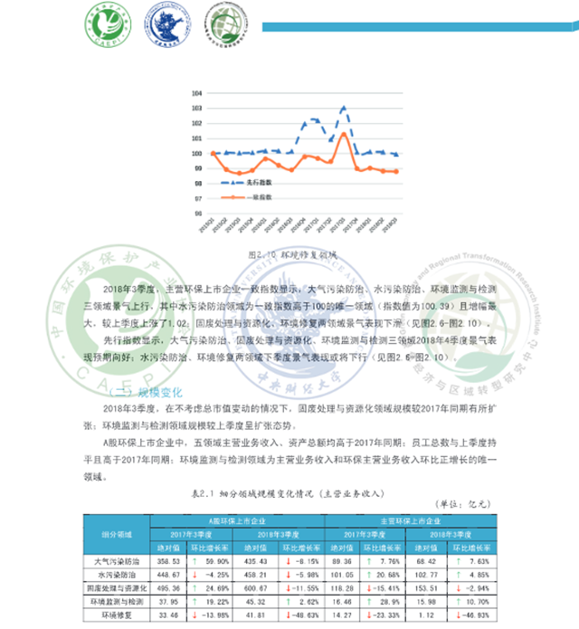 從細(xì)分領(lǐng)域看,A股環(huán)保上市企業(yè)2018年3季度各領(lǐng)域景氣表現(xiàn)呈現(xiàn)不同程度的回暖,主營(yíng)環(huán)保上市企業(yè)在大氣污染防治、水污染防治、環(huán)境監(jiān)測(cè)和檢測(cè)三領(lǐng)域景氣表現(xiàn)回升。固廢處理與資源化領(lǐng)域規(guī)模較2017年同期有所擴(kuò)大, A股環(huán)保上市企業(yè)稅負(fù)壓力同比大幅增加,成本壓力較去年同期明顯減輕,預(yù)計(jì)該領(lǐng)域下季度景氣有望上行:大氣污染防治領(lǐng)域資金外流和國(guó)款情況較2017年同期有所改善,預(yù)計(jì)該領(lǐng)域A股環(huán)保上市企業(yè)下季度景氣表現(xiàn)下滑,主營(yíng)環(huán)保上市企業(yè)下季度景氣有望上行:環(huán)境監(jiān)測(cè)與檢測(cè)領(lǐng)域規(guī)模較上季度呈擴(kuò)張態(tài)勢(shì), 效益表現(xiàn)總體優(yōu)于上季度,下季度該領(lǐng)域景氣表現(xiàn)有望上行:環(huán)境修復(fù)領(lǐng)域營(yíng)運(yùn)能力、現(xiàn)金流量?jī)纛~和流動(dòng)性表現(xiàn)相對(duì)較好,A股環(huán)保上市企業(yè)稅負(fù)壓力較去年同期大幅下降,主營(yíng)環(huán)保上市企業(yè)稅負(fù)壓力快速攀升,預(yù)計(jì)下季度A股環(huán)保上市企業(yè)景氣表現(xiàn)小幅上行,主營(yíng)環(huán)保上市企業(yè)景氣或?qū)⑾禄核廴痉乐晤I(lǐng)域利潤(rùn)總額、流動(dòng)性不及去年同期和上季度,A股環(huán)保上市企業(yè)成本壓力較去年同期有所減輕,主營(yíng)環(huán)保上市企業(yè)稅負(fù)壓力同比小幅減輕,預(yù)計(jì)該領(lǐng)域下季度景氣表現(xiàn)下行。