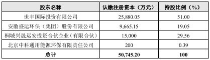 本次世豐國際以自有資金共計 25,880.05 萬元人民幣,通過增資的方式,獲得標的公司 51%的股權(quán),盛運環(huán)保持有標的公司 19.05%的股權(quán),桐城興晟運安投資合伙企業(yè)(有限合伙)持有標的公司 29.56%的股權(quán),北京中科通用能源環(huán)保有限責任公司持有標的公司 0.39%。