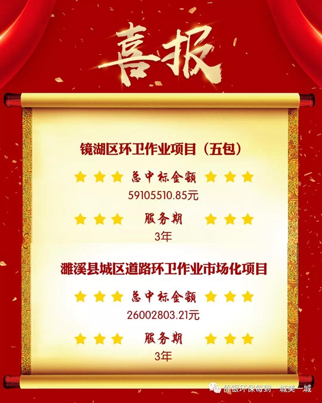 2018年12月7日,蕪湖市公共資源交易服務網(wǎng)發(fā)布公告,僑銀環(huán)保中標鏡湖區(qū)環(huán)衛(wèi)作業(yè)項目(五包),總中標金額為59105510.85元,服務期為3年。