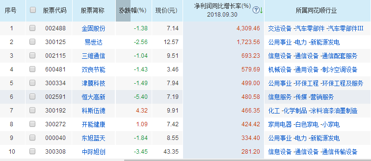 今年三季度環(huán)保股凈利潤同比增長排名前十