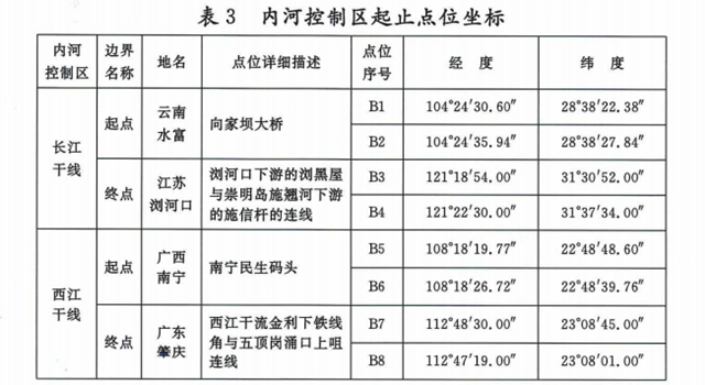 內(nèi)河控制區(qū)范圍為長江干線(云南水富至江蘇瀏河口)、西江干線(廣西南寧至廣東肇慶段)的通航水域,起止點(diǎn)位坐標(biāo)見表3。
