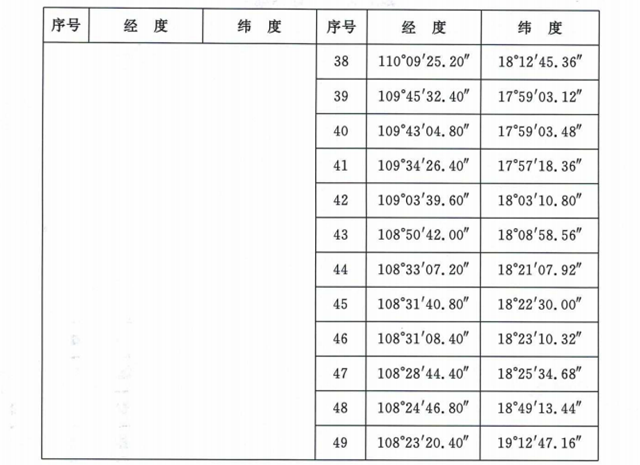 沿海控制區(qū)范圍為表1所列60個(gè)點(diǎn)依次連線以內(nèi)海域,其中海南水域范圍為表2所列20個(gè)點(diǎn)依次連線以內(nèi)海域。