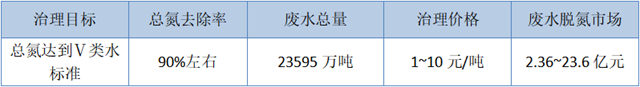 按照2017年的數(shù)據(jù),總氮要達到Ⅴ類水標準,還需去除總氮3855.1噸,總氮排放量4327噸,總氮去除率為90%左右,廢水總量為23595萬噸。市場上對總氮治理每噸價格差別較大,在1~10元之間,治理市場可達2.36~23.6億元。