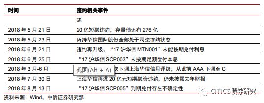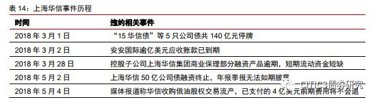 上海華信是一家主要從事石油貿(mào)易的公司。經(jīng)過多次增資及股權(quán)變更,公司控股股東為中國華信,實際控制人為蘇衛(wèi)忠和鄭雄斌。2018年3月,受媒體新聞事件等不利因素的沖擊,多家評級機(jī)構(gòu)連續(xù)下調(diào)公司主體及債項信用等級,流動性資金短缺。2018年5月至今,相繼有4只債券(“17滬華信SCP002”、“17滬華信MTN001”、“17滬華信SCP003”、“17滬華信SCP004”)違約,違約金額高達(dá)85億元。