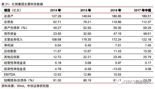 (3)母弱子強(qiáng),子公司盈利下滑觸發(fā)多只債券相繼違約。2017年中報中貨幣資金總額為48.6億元,其中17.4億元歸屬于上市子公司億陽信通,而負(fù)債主要集中在母公司。億陽信通前三季度業(yè)績同比虧損6124.09萬元,聯(lián)合評級下調(diào)其信用評級,外部融資進(jìn)一步惡化。2018年年初“16億陽01”的實質(zhì)性違約,進(jìn)一步暴露集團(tuán)內(nèi)部流動性收縮以及外部融資渠道不暢等風(fēng)險,此后三個季度內(nèi)相繼有4只債券違約。