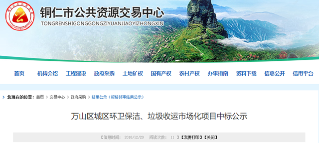 貴州省銅仁市萬山區(qū)城區(qū)環(huán)衛(wèi)保潔、垃圾收運市場化項目發(fā)布中標(biāo)公示,東莞市家寶園林綠化有限公司成為中標(biāo)的社會資本方,中標(biāo)金額為3105萬/年,服務(wù)期限為10年。