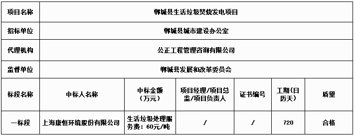 河南省周口市鄲城縣生活垃圾焚燒發(fā)電項目發(fā)布了中標公告,上??岛悱h(huán)境股份有限公司成為中標的社會資本方,生活垃圾處理服務(wù)費為60元/噸。