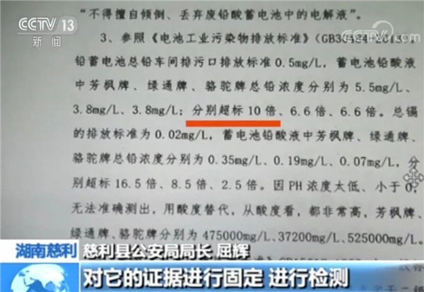 今年2月到9月,湖南省、廣東省等多家第三方檢測(cè)中心傳來消息,警方在案發(fā)現(xiàn)場(chǎng)抽取的非法排放的鉛酸液,最高超過國(guó)家《電池工業(yè)污染排放標(biāo)準(zhǔn)》的10倍;對(duì)案發(fā)現(xiàn)場(chǎng)內(nèi)廁所蹲坑周邊土壤布點(diǎn)采樣,發(fā)現(xiàn)土壤存在重金屬鉛超標(biāo)。