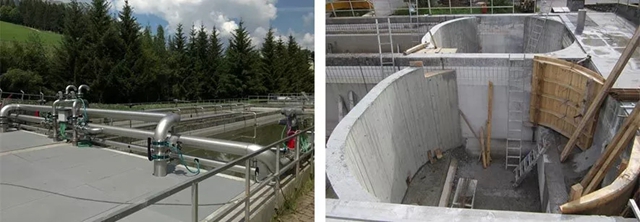 意大利Alta Badia污水廠:左側(cè)是其外觀,右側(cè)展示現(xiàn)有初沉池的污泥料斗區(qū)改造成污泥濃縮池的情況。 | 圖源:NEWport