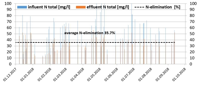 除了上圖的意大利Alta Badia污水廠,AAA沉淀池在德國也有一個案例,人口當量為46000PE,項目內(nèi)容是對兩個現(xiàn)有初沉池進行改造。該系統(tǒng)的COD去除率達66%,平均除磷率為43%,總氮去除率如下圖所示,平均為36%。
