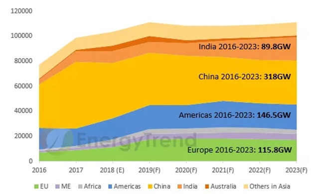 全球市場(chǎng)規(guī)模自2018年起預(yù)計(jì)會(huì)持穩(wěn)在100-120GW之間,各年度需求量變化幅度將低于10%。而根據(jù)集邦新能源網(wǎng)EnergyTrend的最新需求報(bào)告統(tǒng)計(jì),GW級(jí)市場(chǎng)從2016年的6個(gè)成長(zhǎng)到2019年將有15個(gè),可見市場(chǎng)持續(xù)分散化的趨勢(shì)。