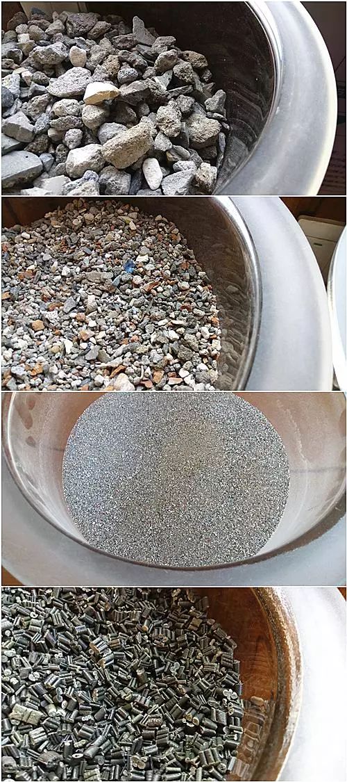 圖片說(shuō)明:自上而下,依次是:大顆粒骨料、小顆粒骨料、粉末骨料和塑料顆粒