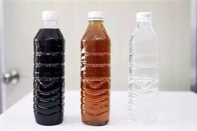 左為進(jìn)水口的垃圾滲濾液,中間一瓶是一級(jí)處理系統(tǒng)中間的一個(gè)環(huán)節(jié)取水,右為經(jīng)過二級(jí)處理后的出水。