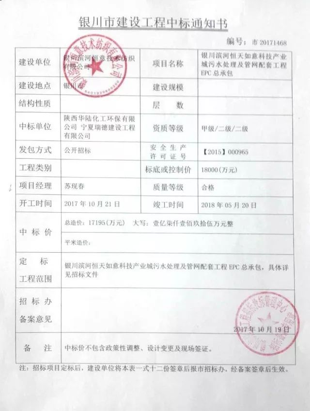 2017年10月19月,華陸環(huán)保憑借著豐富的行業(yè)經(jīng)驗、良好的市場信譽、優(yōu)秀的設(shè)計團(tuán)隊、完善的服務(wù)體系以及專業(yè)的投標(biāo)方案,成功中標(biāo)銀川濱河恒天如意科技產(chǎn)業(yè)城污水處理及管網(wǎng)配套工程EPC總承包項目(以下簡稱:中標(biāo)項目),中標(biāo)金額為1.7195億元。