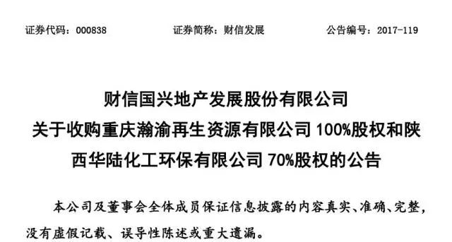 2017年9月29日,財信國興地產(chǎn)發(fā)展股份有限公司(以下簡稱“財信發(fā)展”,股票代碼:000838)收購陜西華陸化工環(huán)保有限公司70%股權(quán)(詳見《財信國興地產(chǎn)發(fā)展股份有限公司關(guān)于收購重慶瀚渝再生資源有限公司100%股權(quán)和陜西華陸化工環(huán)保有限公司70%股權(quán)的公告》),華陸環(huán)保成為財信發(fā)展的控股子公司。