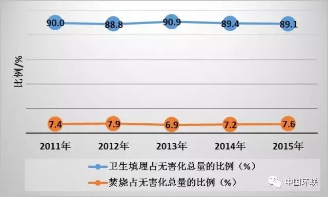 “十二五”期間縣城生活垃圾不同無害化技術(shù)處理比例,填埋比例一直穩(wěn)定在89%左右