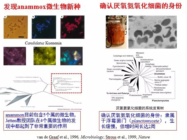 Anammox現(xiàn)象被發(fā)現(xiàn)之后,Kuenen教授的一位主要助手Mike Jetten博士專注于Anammox的微生物學研究,并在加盟荷蘭奈梅亨大學微生物系之后,組織團隊展開了長期的基礎研究工作,發(fā)現(xiàn)和培養(yǎng)了新的參與氮、硫和碳轉化的微生物,采用分子生物學、結構化學和宏基因組學從基因、細胞、個體和生態(tài)系統(tǒng)水平揭示相關微生物的反應機理。