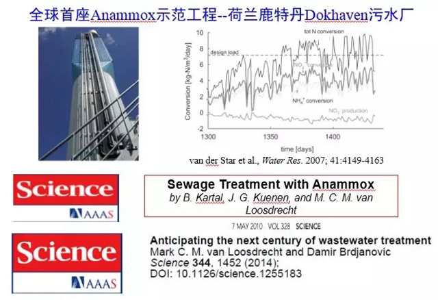 Kuenen教授的另一位主要助手Mark van Loosdrecht教授則在Anammox的實際應用方面有很大的貢獻。他利用數(shù)學模型作為研究工具,并在公司的協(xié)助下,建立了全球第一座Anammox示范工程——荷蘭鹿特丹Dokhaven污水廠。他在2007年和2014年在《Science》上發(fā)表了關于厭氧氨氧化方面的文章。