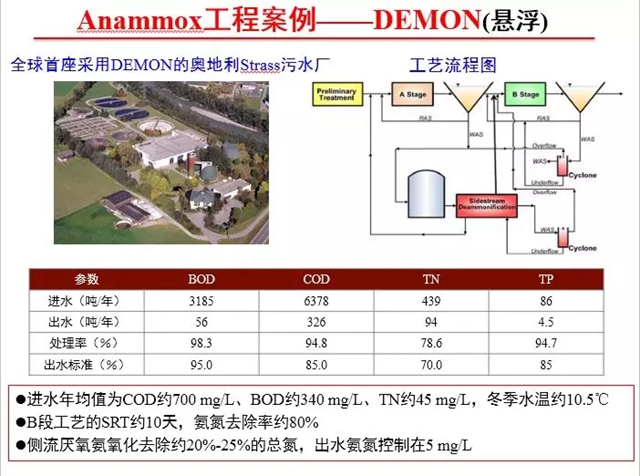 奧地利Strass污水處理廠是全球首座采用DEMON的污水廠。污泥消化液的厭氧氨氧化主要有兩個方面的核心技術:一是基于pH的DO實時控制短程硝化,另一個是基于物理分離技術實現(xiàn)雙泥齡,采用旋流分離器(DEMON1.0),后改進為微篩選擇器(DEMON2.0)。Strass污水廠目前在厭氧氨氧化做的非常成功,氨氮去除率約80%,總氮去除率20%-25%,出水氨氮控制在5mg/L以下。目前這種工藝在美國、德國、瑞士等也都做的非常好。